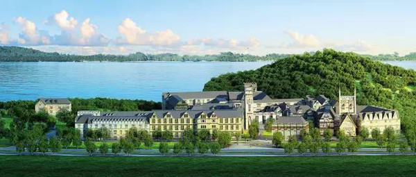 根據用地起伏、靠近松山湖水域的地理位置.點,結合瑞士.具歷史性的古城和修道院建筑,通過棕紅色瓦斜坡屋.和綠色砂巖外墻等.征,打造面向湖畔的斜面風景.
