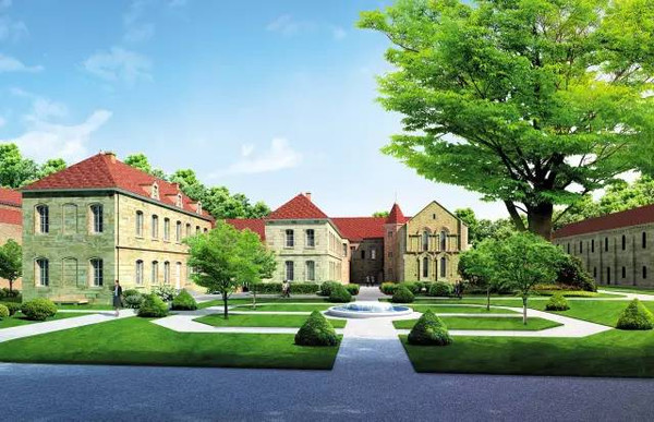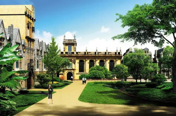 參考牛津大學莊嚴的建筑.征創造街區,結合以灰色板石為材料的大坡度.屋.、米色萊姆石外墻、草坪里院和回廊,使整個街區都可以感受到猶如知識殿堂般的氛圍.
