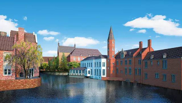參考比利時城市布魯日連綿小建筑物的街區.點,結合紅磚外墻、階梯式陡坡屋.等外觀.征,以及.具.色的鐘塔和拱形石橋設計,形成了與自然環境契合的街區空間.