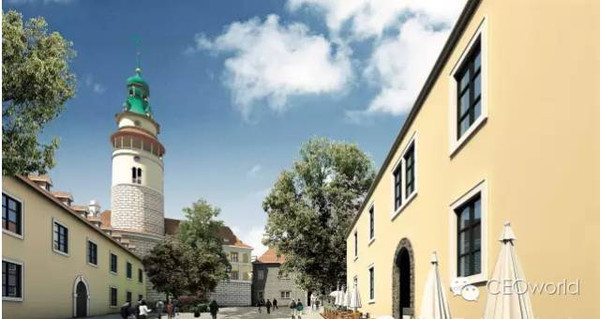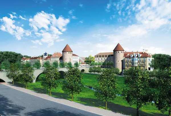 參考捷克小鎮克倫諾夫的城堡、教堂、修道院等大型建筑的建筑.色,整合蜿蜒曲折、壯麗秀美的河流,構成尺度宜人的步行空間.