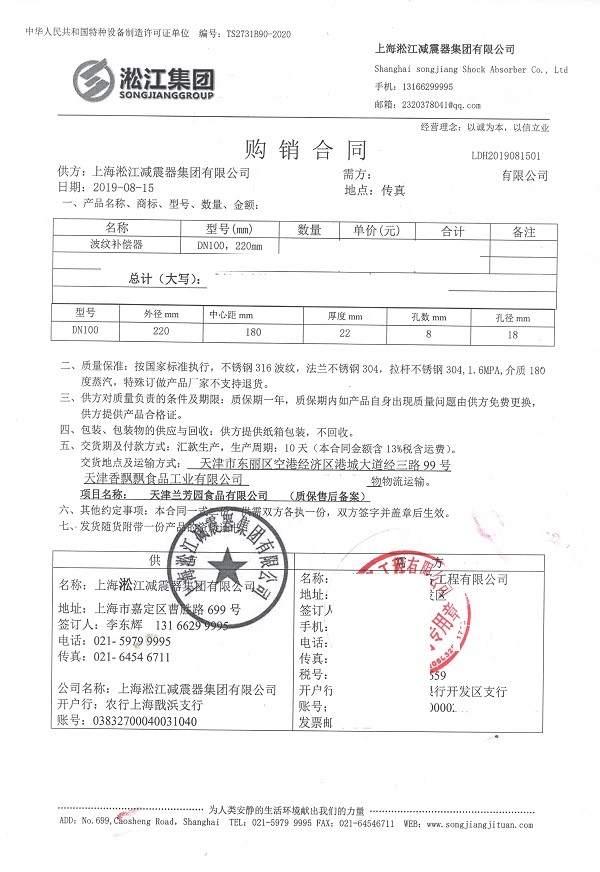 上海淞江減震器集團有限公司官方網站為您介紹:【天津蘭芳園食品香飄飄奶茶項目】波紋補償器合同信息,淞江集團為眾多食品企業(yè)提供衛(wèi)生級減震器產品,我廠食品級橡膠接頭通過國家質檢部門通過并頒發(fā)檢測報告。